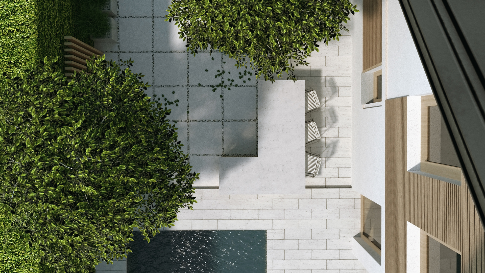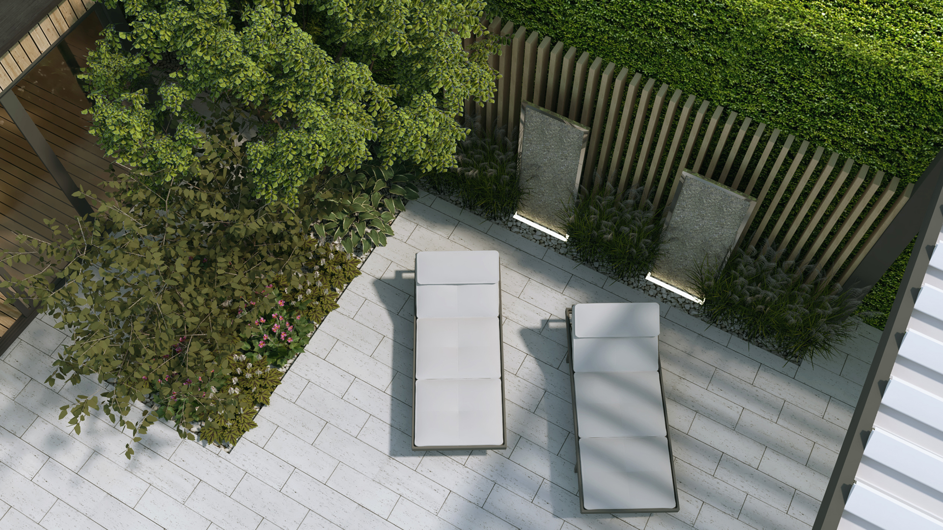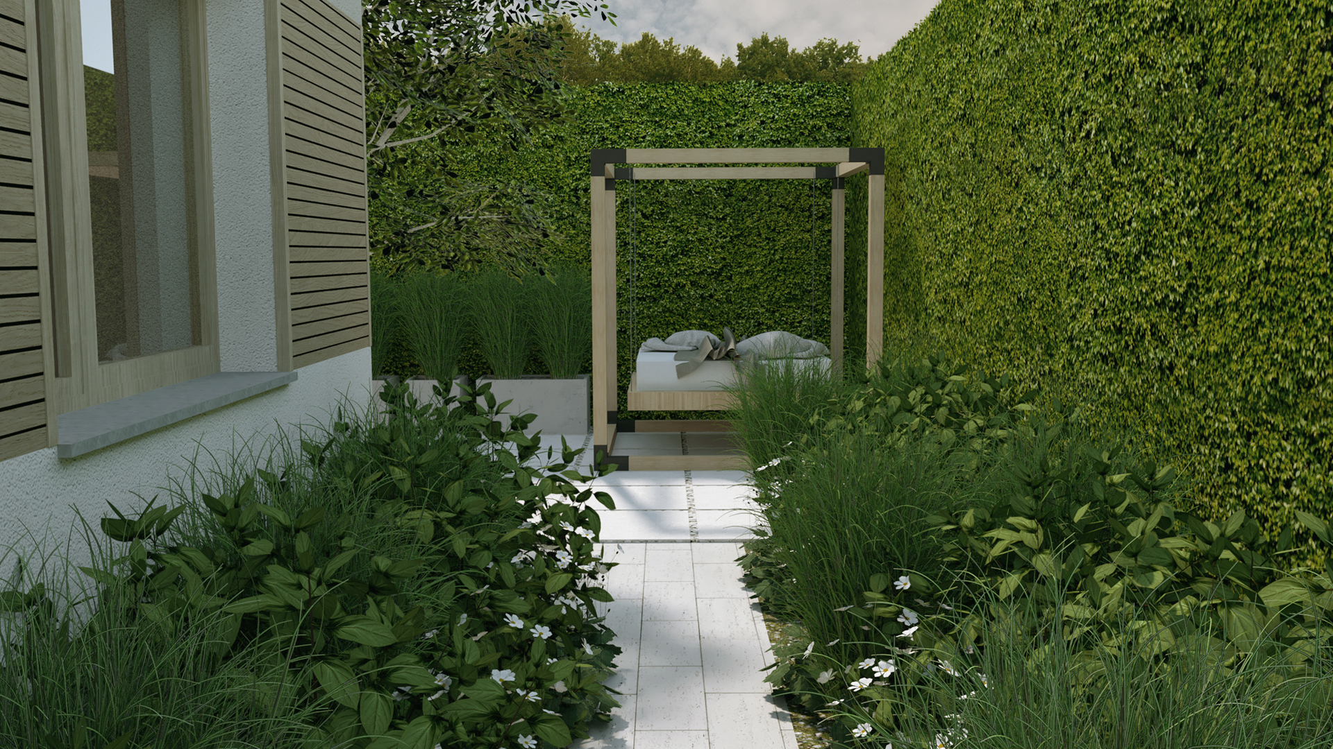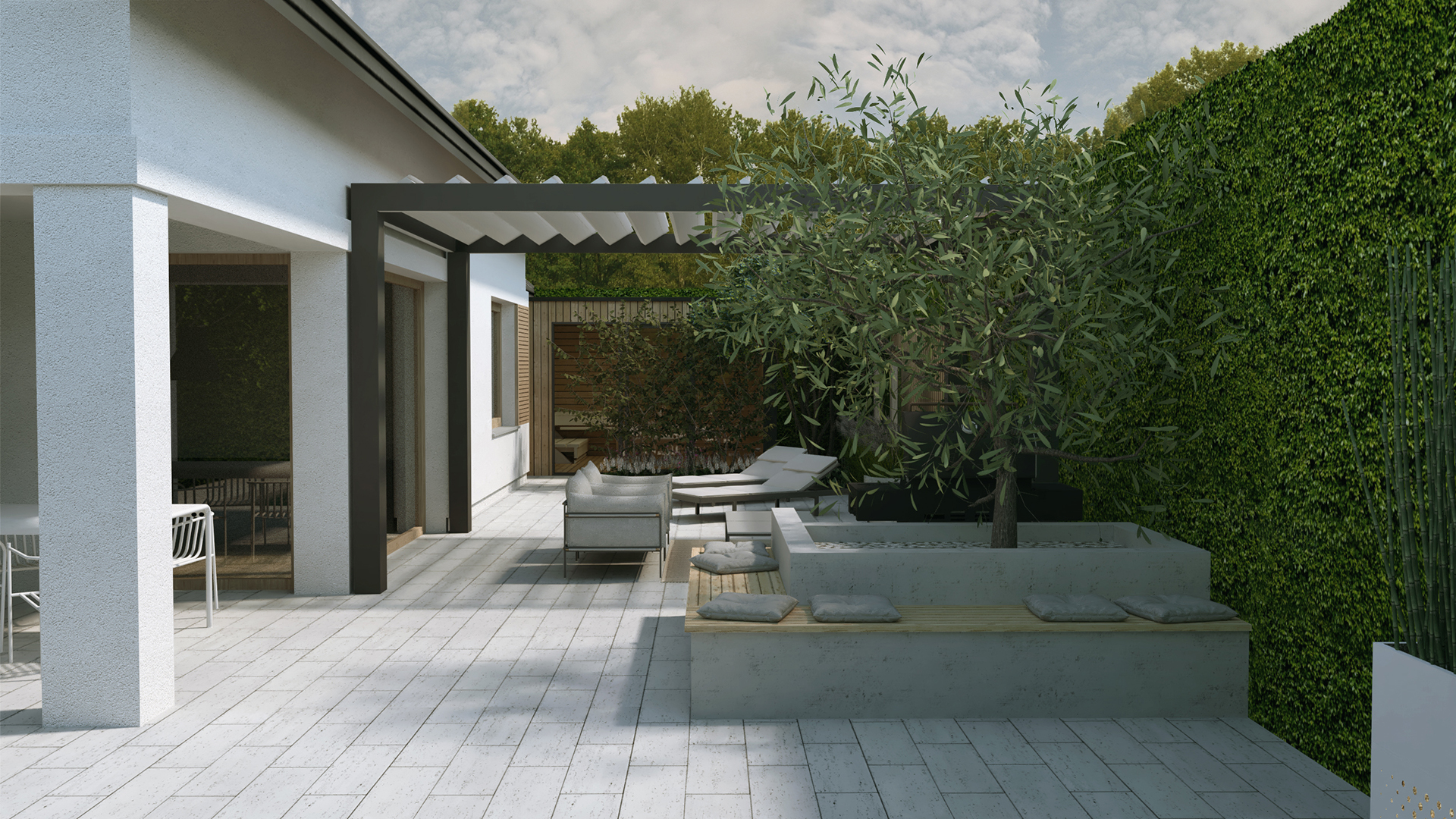 Ogród wyróżnia się paradoksalnie niewielkim stosunkiem powierzchni zieleni do nawierzchni. Ma to jednak swoje uzasadnienie i zostało wprowadzone w sposób kontrolowany. Styl ogrodu miał bowiem nawiązywać do Miami a zdecydowana większość nawierzchni była już wykonana. Musiałam ją więc nieco zmodyfikować, dopełnić, nadal tej przestrzeni wakacyjny sznyt. Bogato więc uzupełniona została ta przestrzeń w elementy zagospodarowania sprzyjające odpoczynkowi. Istniejący basen, barek, wiszące łóżko ogrodowe, taras z kompletem wypoczynkowym zadaszony pergolą, ławki z donicą na egzotyczne drzewko, ściany wodne oraz sauna z siłownią, znalazły się na jasnej, kamiennej nawierzchni. Zieleń, która tej niebanalnej przestrzeni nie zdominowała, jest jej idealnym tłem i uzupełnieniem.