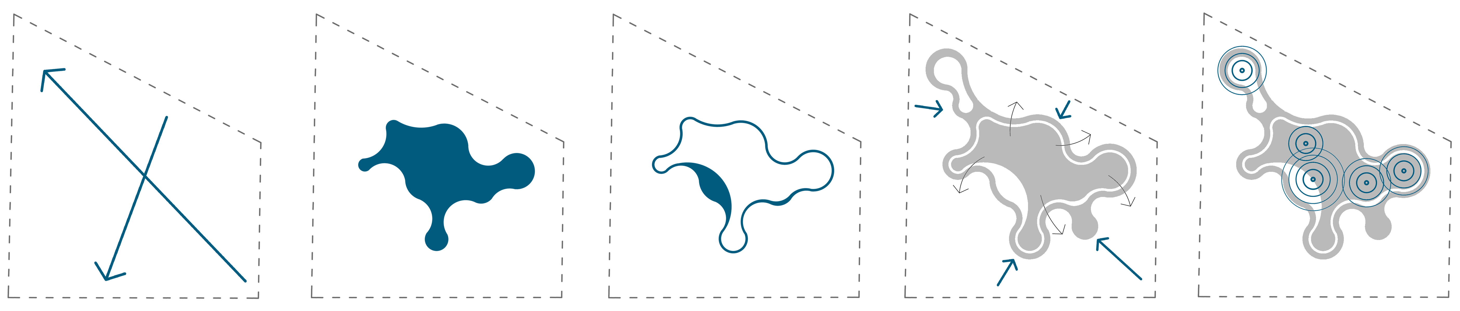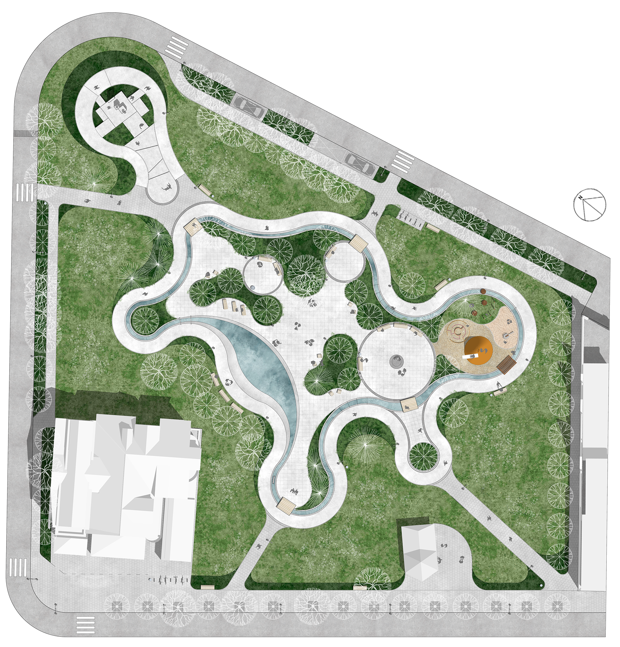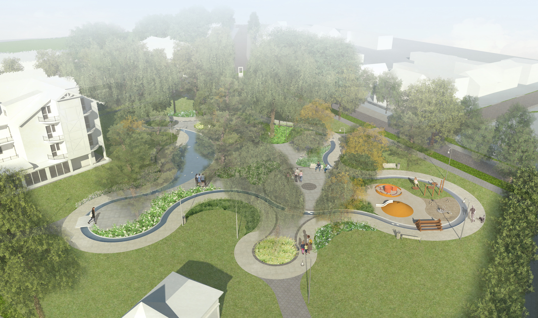 seniorzy, turyści, dzięki czemu sprzyjają integracji międzypokoleniowej. Aby nadać unikalności tej niebanalnej przestrzeni, strefy zostały otoczone ciekiem wodnym oraz wyspami zieleni, które w naturalny i subtelny sposób je wydzielają.