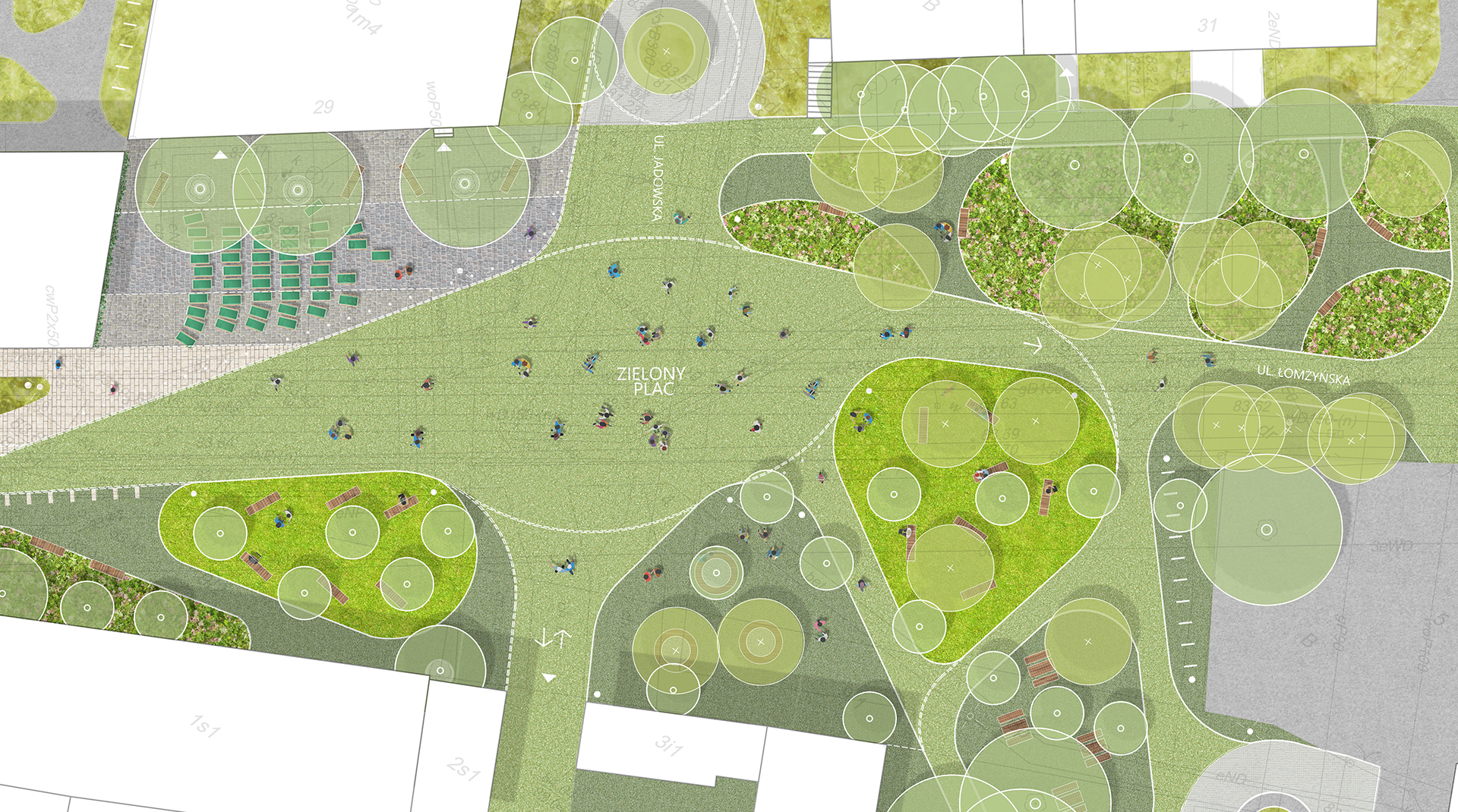 Celem projektu było przekształcenie poszerzonego fragmentu ulicy Łomżyńskiej u zbiegu z ul. Jadowską, w podwórzec miejski o charakterze zielonego placu, będącego atrakcyjną i funkcjonalną przestrzenią publiczną. Idea projektu, jest oparta o bezpośrednie skojarzenie terenu z nazwą „Zielony Plac”. Kolor zielony na placu, pojawia się we wszystkich wymiarach: na powierzchni płaskiej – w postaci różnorodnych nawierzchni oraz w przestrzeni – w postaci roślinności. Bezpośrednie odniesienie nazwy projektowanego miejsca do jego wyglądu, miało na celu jego unikatową identyfikację w przestrzeni oraz wywoływanie skojarzeń u odbiorcy, dzięki którym plac, będzie lepiej rozpoznawalny i bardziej indywidualny na tle okolicy, dzielnicy i miasta, w którym się znajduje.
